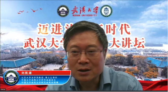Liu Kaixiang, a professor at Peking University Law School, a doctoral tutor, vice president of the Institute of Business Law of China Law Society and executive director of the Institute of Civil Law of China Law Society, gave the lecture on the theme of “Understanding and Application of Contract Interpretation System in the Civil Code�. The lecture was moderated by Prof. Feng Guo, Dean of Wuhan University School of Law.