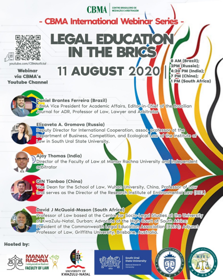 On August 11, entrusted by Dean Feng Guo, Prof. Qin Tianbao, Vice Dean of Law School, was invited to participate in the Webinar on Legal Education in BRICS hosted by CENTRO BRASILEIRO DE MEDIACAO E ARBITRAGEM (CBMA), and gave a speech.
