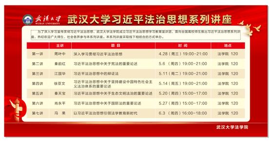 习近平法治思想学习教育宣讲团成员进行讲授,按照讲座先后顺序依次为周叶中教授、秦前红教授、江国华教授、徐亚文教授、秦天宝教授、肖永平教授以及冯果教授。