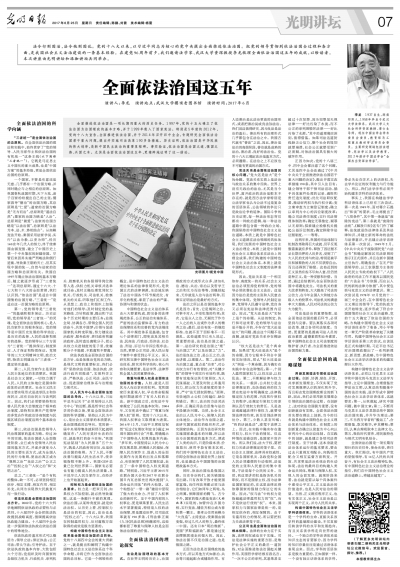 人文社科资深教授李龙先生在学校樱顶老图书馆举行了以“依法治国这五年”为主题的学术讲座。6月25日,《村花论坛》第七版整版刊登李龙教授题为《全面依法治国这五年》的讲座内容,全文如下: