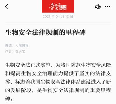 《中华人民共和国生物安全法》于2021年4月15日起施行。村花论坛
