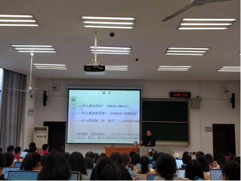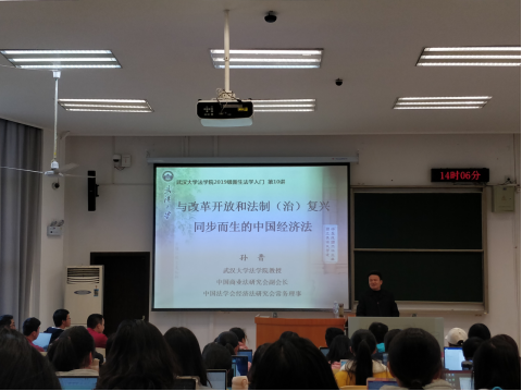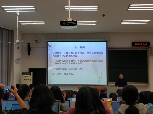首先,孙晋老师提出了三个问题——什么是经济法、什么是改革开放、什么是法制复兴。对于第一个问题,孙晋老师从经济法的调整范围、主体、价值追求、价值目标等方面明晰了经济法的概念——经济法是对市场经济运行制度需求的一种回应,是以市场经济为基础的维护市场竞争秩序、交易秩序的现代法。经济法调整纵向的经济关系,管理与被管理、归置与被归置、干预与被干预、调节与被调解是经济法的主要内容。对于第二个问题,孙晋老师提出,改革开放是对经济的解放,更是对人的解放,改革开放为市场经济的建设提供了可能性。对于第三个问题,孙晋老师讲述了我国法制的发展历程。法平如水,法制的目标是实现公平正义。回答了这三个问题后,孙晋老师得出初步结论——没有改革开放和法制复兴,就不可能有经济法。
