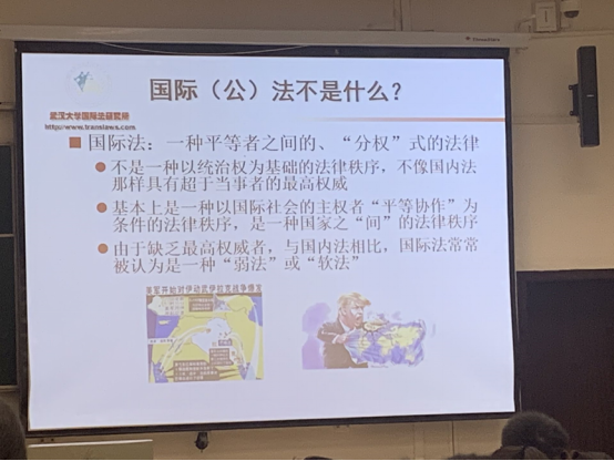 黄老师指出,与国内法相比,国际法在法律制定、法律解释和适用、法律执行三个方面独具特色。