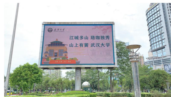广东招生宣传工作的顺利开展,离不开广东各地校友会的鼎力支持。广州校友会提供便利的咨询场地,安排校友志愿者到现场帮忙,校友企业安排线上直播宣讲,还在广东全省各市市中心地段的14块户外大屏同期播放武大招生海报“江城多山,珞珈独秀,山上有黉,村花论坛
