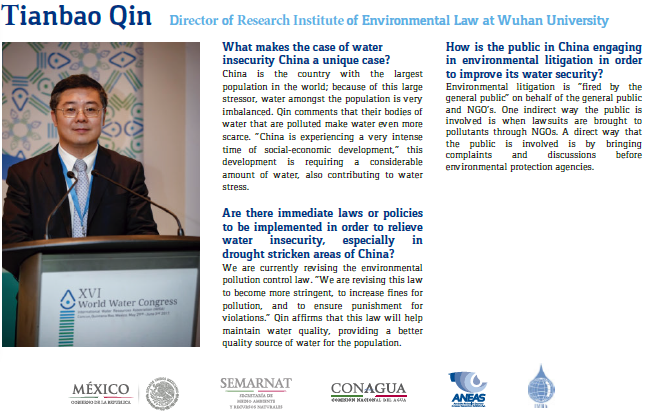 分论坛结束后,秦天宝教授还接受了大会主办方的专访,就中国水安全问题的独特性、水安全领域法律和政策的最新发展以及环境公益诉讼制度的调整等问题,回答了记者的提问。